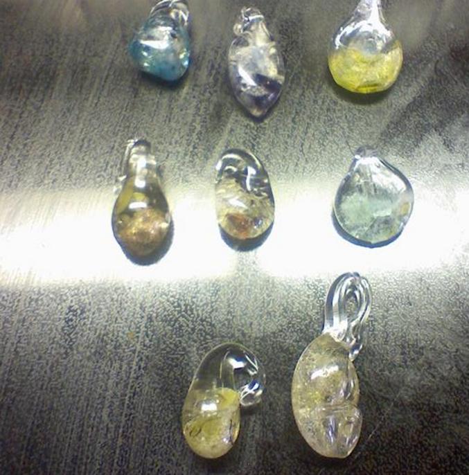 Cremains in Glass: Memorial Pendants, Widow Jewelry and Whimsical glass art with loved one's cremains encased within created by Che, Single Pendent $25.00, 3 item package $75.00, Half a dozen glass flowers $50.00. Call or email me for details.